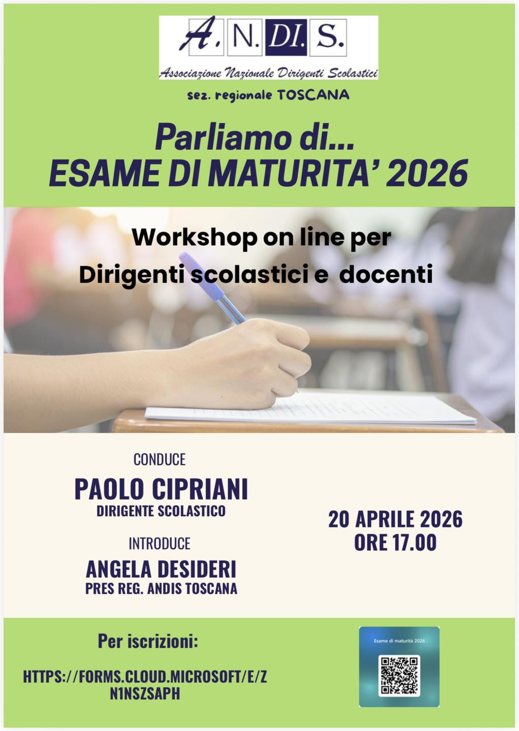 Workschop online per dirigenti scolastici e docenti lunedì 20 Aprile 2026 in allegato locandina evento